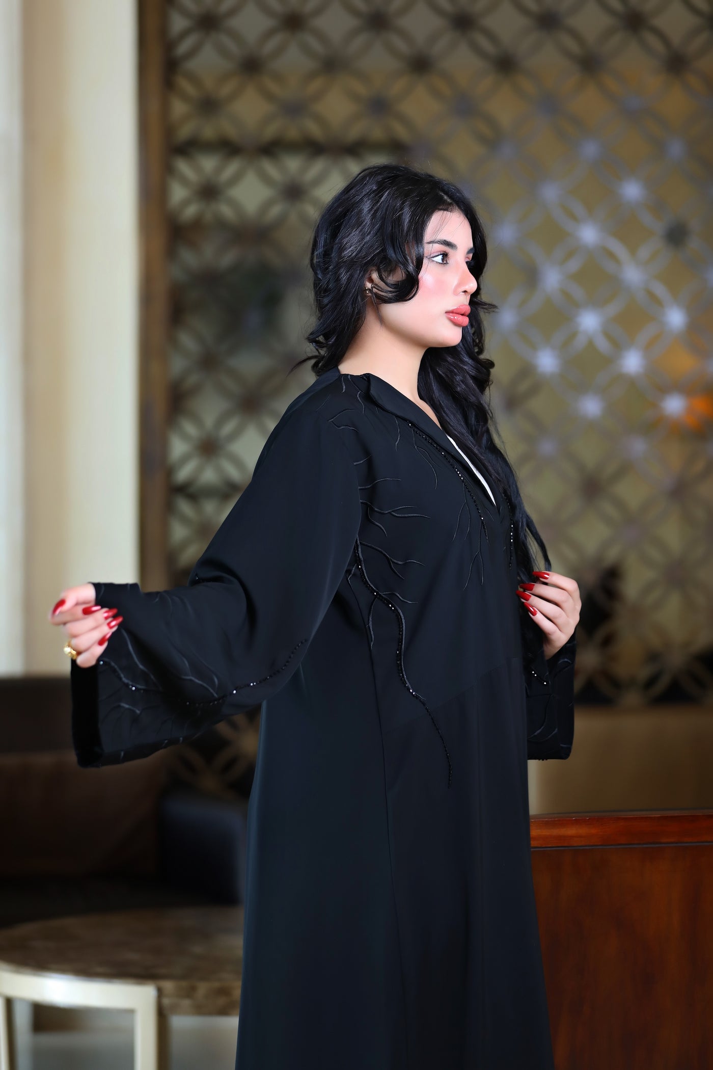 This dark black Kuwaiti-cut abaya features a luxurious beaded Nada chest and sleeve design, with light Nada fabric on the back and hem. Its distinctive style ensures you stand out with bold elegance at any event.