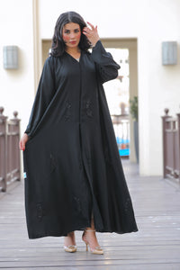 The black Leaves Cloche abaya features a bold leaf design on front and back, creating a striking look. Crafted from premium materials, it offers a sleek fit while ensuring comfort and ease of movement. Perfect for women who want to stand out with daring style and elegance on any occasion.