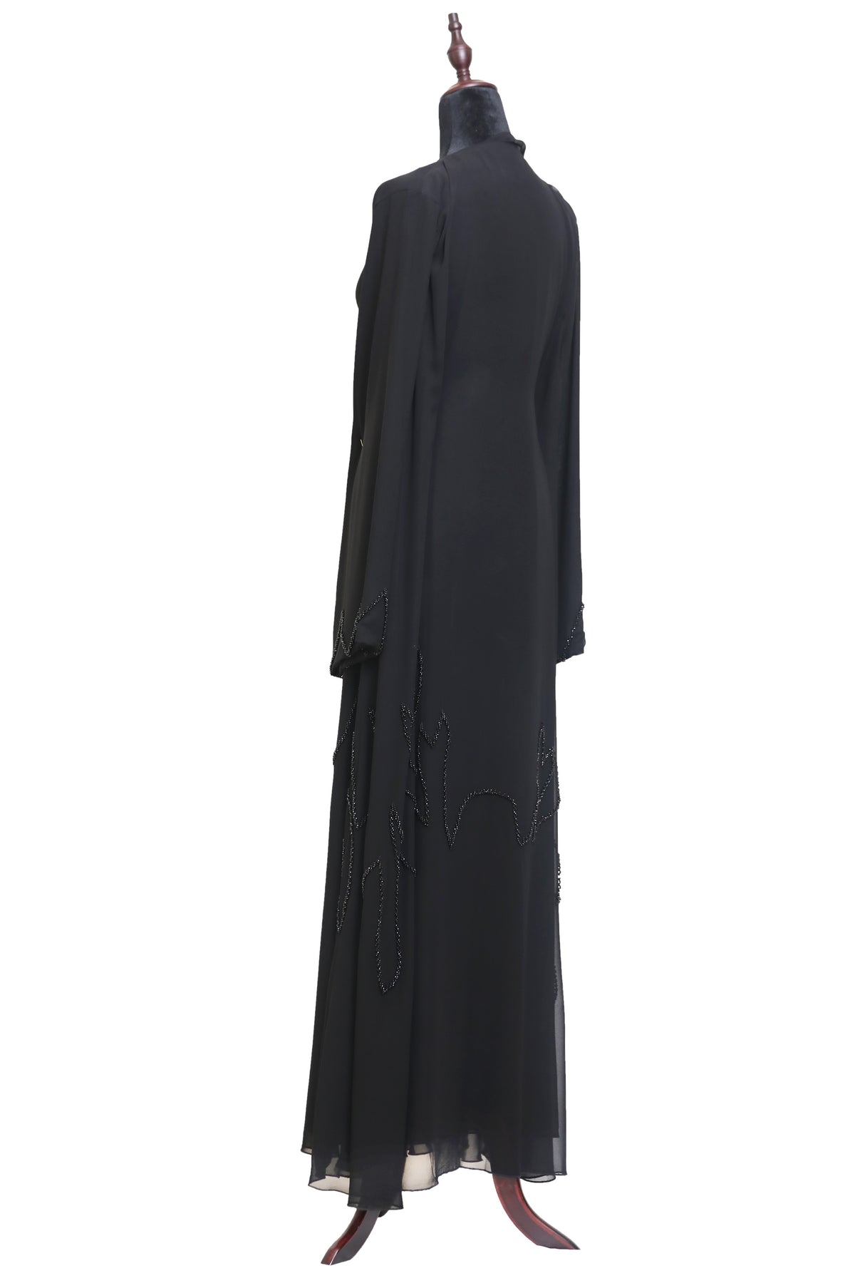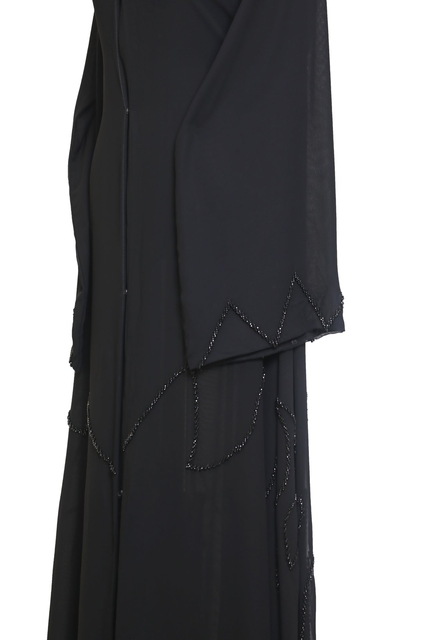 Elevate your style with this striking double chiffon abaya adorned with intricate beadwork. Its swirling patterns flow gracefully from the hem through the sleeves, accentuating the unique flared silhouette. Designed for those who dare to stand out, this abaya radiates sophistication and femininity, perfect for making a powerful statement at any event or in daily wear. Own this captivating piece and leave a lasting impression wherever you go.
